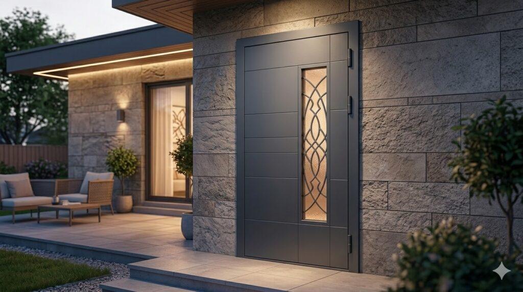 - Вставки из нержавеющей стали: Тонкие молдинги, придающие двери современный технологичный вид.